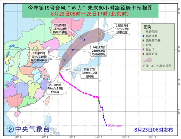 据中央气象台网站消息,中央气象台8月23日06时继续发布台风蓝色预警:今年第19号台风“苏力”于今天(23日,下同)凌晨由强台风级减弱为台风级,早晨5点钟其中心位于东海东北部海面,就是北纬33.0度、东经125.5度,中心附近最大风力有13级(40米/秒),中心最低气压为960百帕,七级风圈半径260-400公里,十级风圈半径100-120公里,十二级风圈半径50公里。