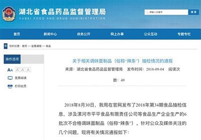 湖北省食品药品监督管理局官方网站发布辣条抽检情况通报。网站截图