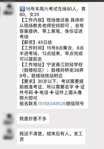 根据读者提供的线索,记者经过几次身份验证,进入了该代考圈。据介绍,考试于9月15日上午举行,很简单,把答案抄写到试卷上即可。劳务费45元。