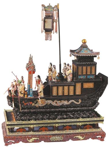 广式木雕素来以立体通雕、满屏雕和多层次雕刻相结合的风格著称。广州博物馆收藏的这件木雕楼船,就是体现这种工艺风格的代表性作品。它的船身由紫檀雕刻而成,屋檐、窗底等部件镶嵌珐琅。楼船呈三级台阶式造型。船底海浪纹,象征扬帆海上,长风万里。船身饰珐琅双龙戏珠图案。船身第一层饰有6个人物雕像,有老有少,有肥有瘦,均手持船桨环立四周,人物形态各异,栩栩如生。中间立有一紫檀牌坊,牌坊底部饰有珐琅。牌坊内侧置一楼梯,沿楼梯可上至二层。第二层也是6个人物雕像,其中一为献寿童子,手持寿桃,正向一位贵妇人祝寿。中间立一插座,可插宫灯,宫灯四角饰有珊瑚流苏珠串,由龙首衔着。第三层是珐琅顶,四面雕窗楼阁,楼阁四角挂有铃铛。