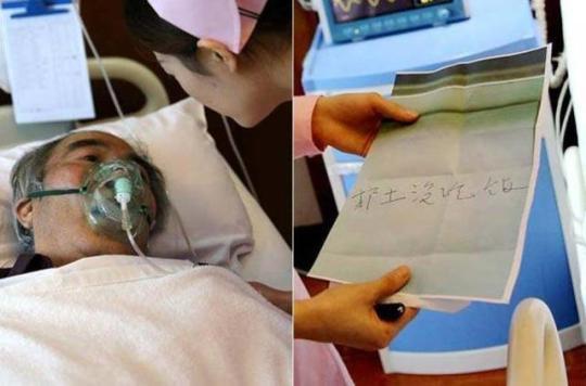 护士递上纸笔,老人用颤颤巍巍的手写下“护士没吃饭”五个字。