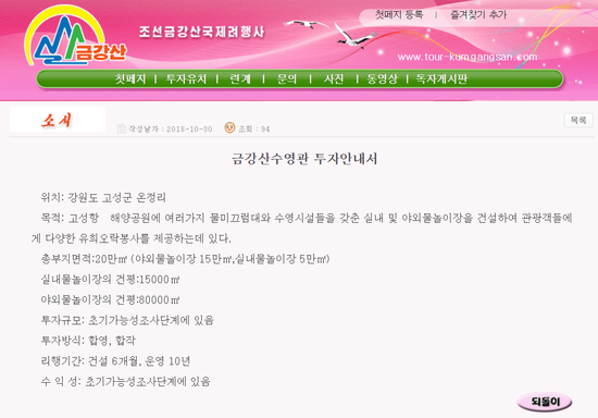 此外,该网站还在6日先后刊登了金刚山旅游特产展区和内金刚医院的建设投资公告。