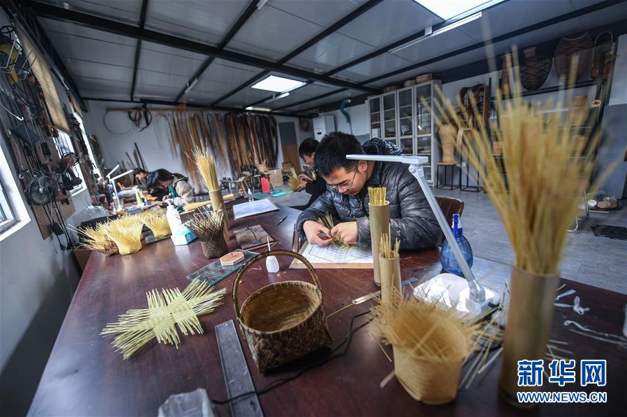 在乌镇陈庄村竹芸工房内,工作人员在制作竹编产品(11月20日摄)。 新华社记者 徐昱 摄