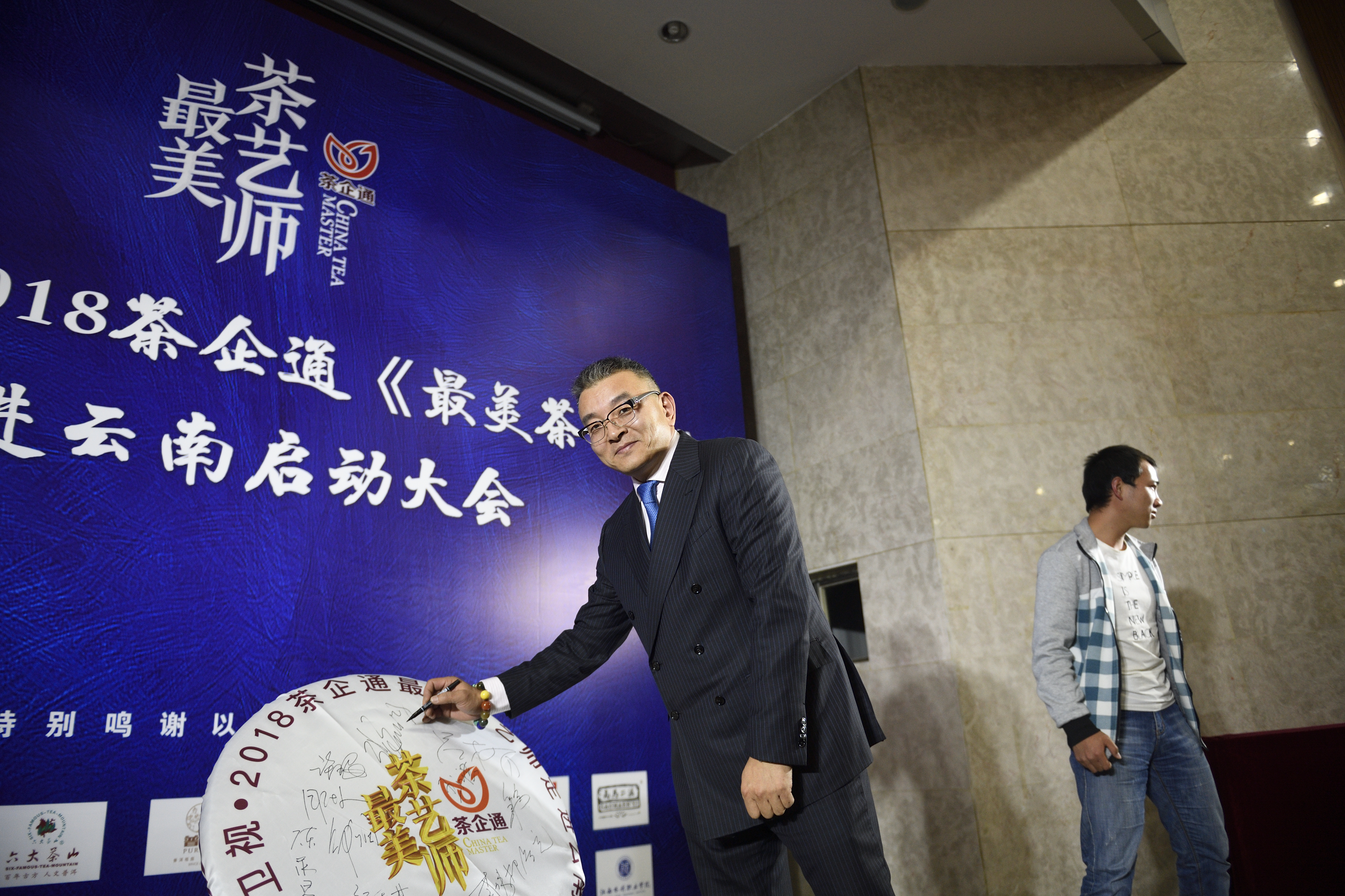 茶企通总经理张瀛鸿在启动仪式上为茶饼签名留念 人民政协报 -人民政协网 记者 田福良摄