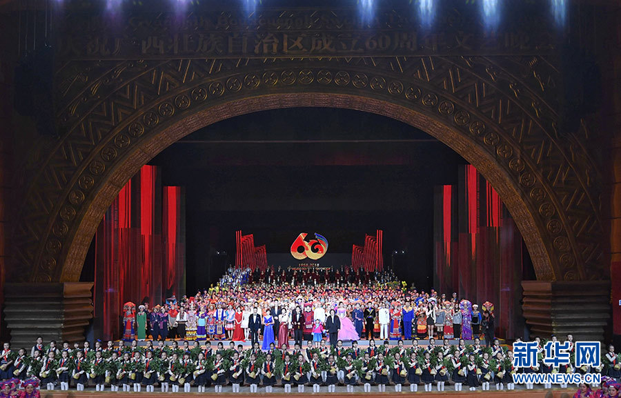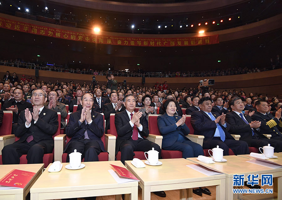 12月9日,庆祝广西壮族自治区成立60周年文艺晚会《壮志飞扬》在广西文化艺术中心精彩上演。中共中央政治局常委、全国政协主席、中央代表团团长汪洋和各族各界干部群众等近900人观看演出。 新华社记者 申宏 摄