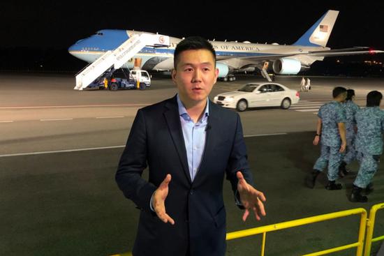 △新加坡巴耶利峇空军基地,央视记者王冠在特朗普专机前出镜报道。