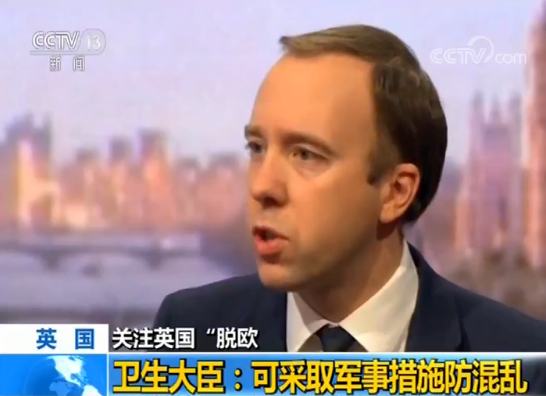 27号,英国卫生大臣马特·汉考克则表示,如果无协议“脱欧”引发社会混乱的话,英国可以采取军事管制措施,但这不是目前政府的工作重点。