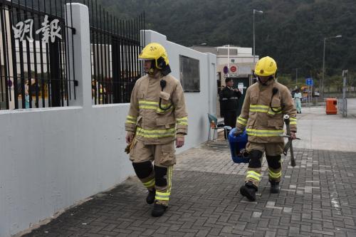 香港一工人在土豆筐内发现手榴弹,疑为第一次世界大战时遗留,警方现场将其引爆,图为消防员到场戒备。图片来源:香港《明报》/钟炳然 摄