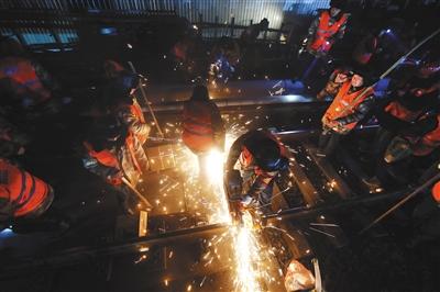 昨日凌晨,工人用电锯切割钢轨,锯齿和钢轨不断摩擦出明亮的火花。本版摄影/新京报记者 王贵彬