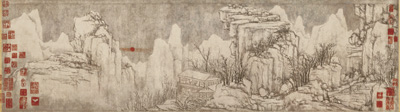 黄公望的雪图,没有一个人,消除了一般的人类活动。或者可以说,这画面不只为了观看,也是为了闭目冥想。也许,一幅名为《槐荫消夏图》的画可以给我们一些启发。盛夏的午后,庭院中槐树下,文士在榻上午休。榻上有一扇屏风,画了一幅雪景。能够用于消夏避暑,说明雪景不只是为了与冬天的寒冷呼应,而是以寒冷的景物来使人清凉。画中文士已惬意地入眠,对他而言,屏风上的雪图,作用的不是他的眼睛,而是心灵。难道不是这样吗?雪图中巨石和寒林下的水面,有一艘驶来的小船。这正像入眠的文士在梦境中悠游。