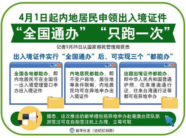 4月1日起出国出境证件实行“全国通办”。即内地居民可在全国任一出入境管理窗口申请办理,申办手续与户籍地一致。