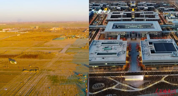 △雄安市民服务中心建设前后。(左图为中建三局提供,右图杨亚文摄)