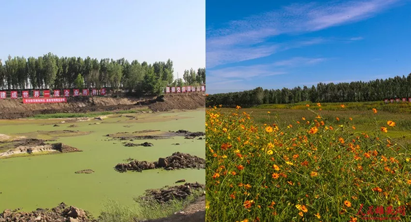 △唐河污水库修复前后(左图为中交一公局供图,右图王京卓摄)