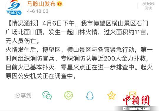 中新网合肥4月6日电 据安徽省马鞍山市委宣传部新闻发布官方微博6日消息,4月6日下午,该市博望区横山景区石门广场北面山顶,发生一起山林火情,过火面积约11亩,无人员伤亡。