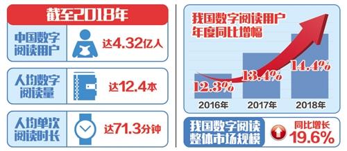 4月12日至14日,第五届中国数字阅读大会在杭州召开。会上发布的《2018年度中国数字阅读白皮书》显示,截至2018年,中国数字阅读用户总量达到4.32亿,人均数字阅读量达到12.4本,人均单次阅读时长达71.3分钟。我国数字阅读整体市场规模已达到254.5亿元,同比增长19.6%,大众阅读市场规模占比逾九成,是产业发展主导力量。