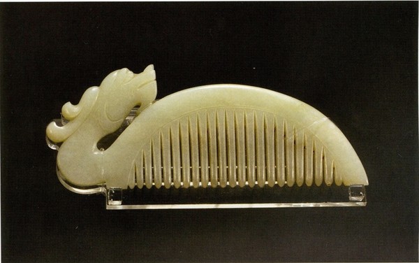 玉梳,古时称为“玉栉”,是一种通体扁平、大致呈梯形的发饰,将它插戴在头发上,既可绾发,又可作为装饰。明代妇女以头上插戴玉梳为时尚。在明代杂剧作家贾仲明的作品《荆楚臣重对玉梳记》(又名《对玉梳》)中,玉梳不仅是装饰物,也是男女间的定情信物。明代玉梳多为传世品,数量稀少,因此十分珍贵。