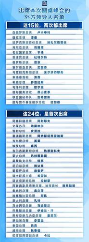 27日,随着圆桌峰会联合公报发布,这39位领导人的名单也浮出水面。他们包括22位国家元首、1位副总统兼总理、13位政府首脑、1位副总统和2位国际组织负责人。而出席上次圆桌峰会的外方领导人共有32人,包括15位国家元首、14位政府首脑、3位国际组织负责人。
