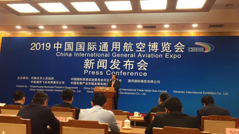 5月8日,2019中国国际通用航空博览会(石家庄航展)组委会在北京国谊宾馆召开新闻发布会,正式发布会址会期。会上,主办方石家庄市人民政府、中国国际贸易促进委员会河北省委员会、通用国际展览有限公司、中航通用飞机有限责任公司、中国宏泰产业市镇发展有限公司向到场的中外媒体通报了本届航展的时间地点、主要活动及筹备进展情况等。