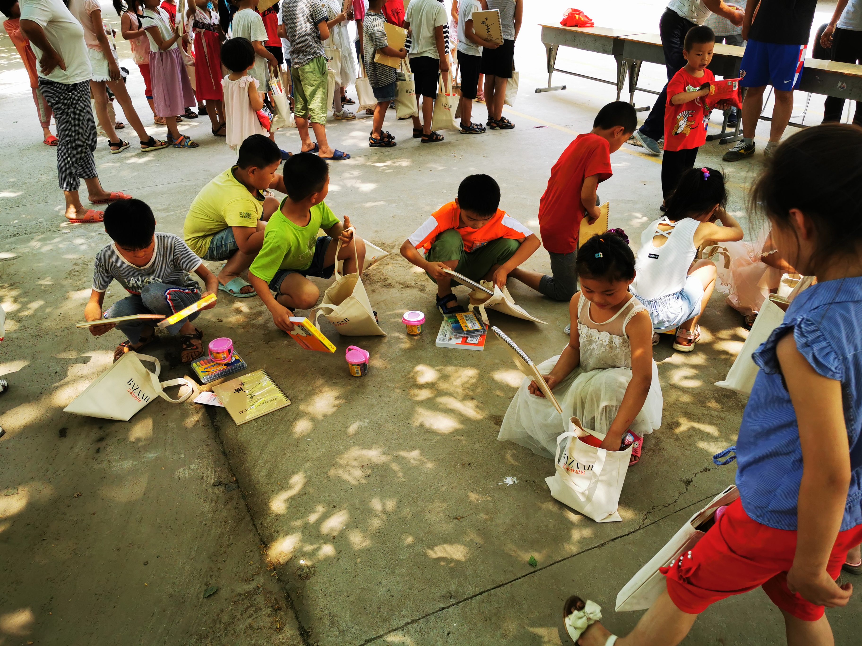 图为孩子们开心的打开“艺术梦想包”。