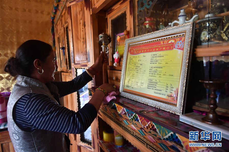 在青海省玉树藏族自治州治多县治渠乡同卡村,村民昂文西让的妻子布沙措江卓玛清理家里的柜子(9月12日摄)。新华社记者 孙瑞博 摄