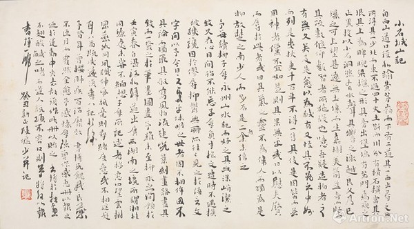 本幅写于是年冬,以雪实寺上的大厂村入景,属纪游写实之作。画中所见崇山茂林荫护下,房舍数间,聚结成乡,其地前临溪、背靠岗,村民或赶牲口过桥、或洗濯于溪畔、或挑水荷锄而归,入眼一片乡野寂静,无车马之喧嚣,迹近武陵桃源,难怪画笔下所写正是“云中鸡犬感”。