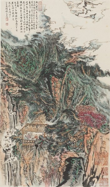 此画纵86cm,横50cm,纸本设色,创作于1988年,为画者晚年创作之精品。阴崖结庐而居,芝草琅玕而伴。此历代文人隐居所共同向往之境界。画家对归隐似乎有着不可名状的情结。画家一生中画过很多隐居题材的作品,甚至画家早年也曾尝试在浙江德清上柏山中隐居。此画正是写求仙访道之隐居。画中前景山石用笔简洁老辣,墨色恰如其分。远景山峰写细密繁琐一路,全师元代王叔明(王蒙)笔法,皆从牛毛、解锁皴法中出。中锋、侧锋并用,线条笔笔如碑学书法一样铿锵有力。线条之间墨块的巧妙运用,浓淡相宜,使得画面更加生动自然。尤其是远景退却,与烟云交错之处,恍若真景象,别开一番境界。