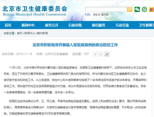 北京市卫健委:一名鼠疫患者病情危重 但未进一步恶化