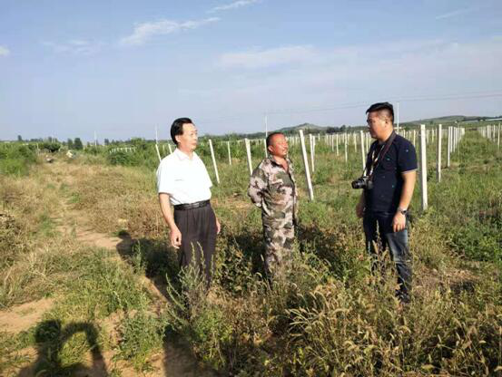 图为2019年夏天,韩庆全(左一)到泰安泰山兴隆农场采访调研扶贫事业新路子
