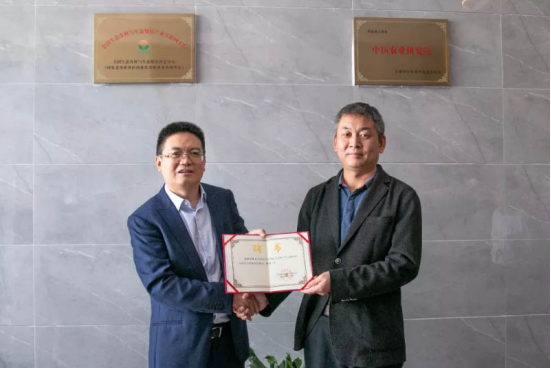 图:赵荣水主任给好实再集团董事长张天文发“生态食材与生态餐馆评定委员会专家委员”证书