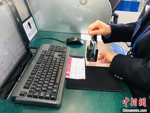 图为兰州边检站民警核对人员及证件信息无误后,盖章放行。艾庆龙 摄