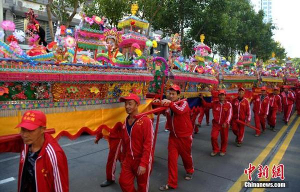 12月14日,传统民俗活动蜈蚣阁亮相厦门海沧钟山送王船文化节。当日,三年一届的厦门海沧钟山送王船文化节在海沧钟山水美宫开幕。 中新社记者 张斌 摄