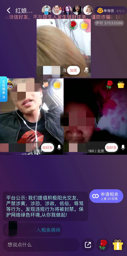 中新经纬记者在伊对平台完成注册后,系统随即弹出了某相亲直播间的邀请,这样的邀请每隔几秒就会有一次。随后,中新经纬记者围观了多个正在进行视频相亲的直播间,但透过手机屏幕上的画面,让人很难相信这是在相亲。