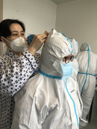王泠(左后)在为护理队员仔细整理防护服,叮嘱她们在做好工作的同时一定要注意保护好自己。