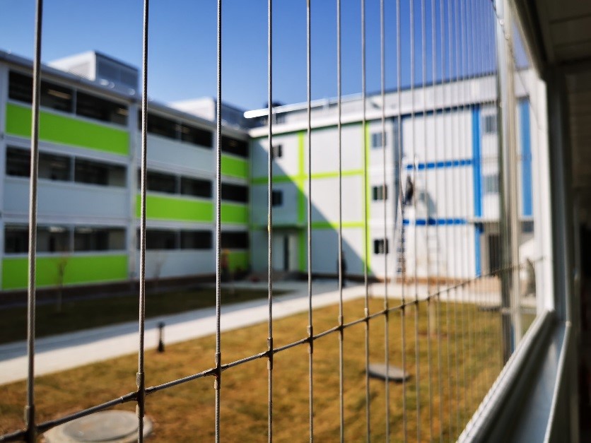 值得一提的还有隐形窗的设计。出于人员管理的必要,病区必须加装防护窗,然而,此前的设计方案,始终带给人一种压抑感、恐惧感。这种感受,对于入住人员来说,百害而无一利。怎么能既满足防护需求,又回避恐惧压抑之感呢?在设计单位倍感无奈之际,杨磊适时提出了安装“隐形护栏”的思路,实现远看无栏、近看有网的效果。