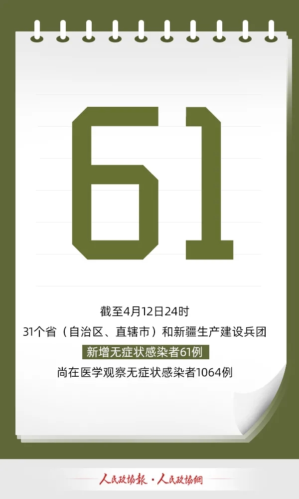 31个省(自治区、直辖市)和新疆生产建设兵团报告新增无症状感染者61例,其中境外输入无症状感染者12例;当日转为确诊病例28例(境外输入28例);当日解除医学观察55例(境外输入9例);尚在医学观察无症状感染者1064例(境外输入307例)。