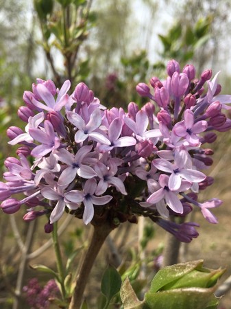 紫丁香这个物种的名字好像是根据她的花型花色和香味起的。圆锥花序上生长出一个一个的小花从淡紫到深紫色,许许多多的花排在一起,聚成了大朵。没有开的花蕾就像一个一个的直钉,而开了的花就如打开的桶状的铆钉,细长的小桶顶端裂成了四瓣。而她的花香雅致悠长、独特,具有明显的辨识度,也是我所见过的灌木类花植中最浓郁的。