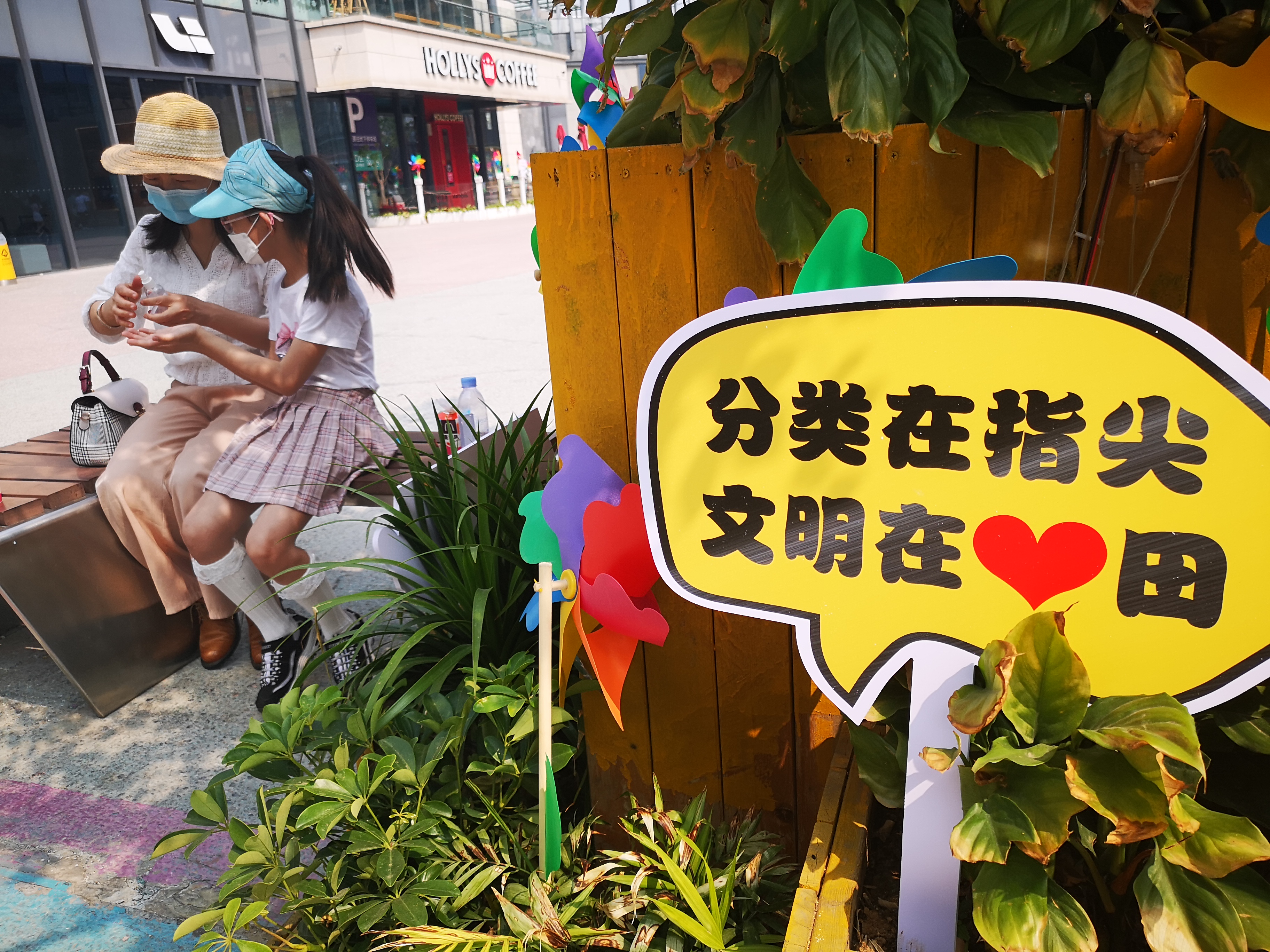 正值五一假期,街道工作人员在五棵松商圈的花箱里现场安装了一些五颜六色的垃圾分类宣言板和随风转动的小风车,增添了几分节日气息。这些宣言板是万寿路街道结合垃圾分类重点和街区特点,筛选出一批妙趣横生又极具教育意义的主题标语进行设计制作;多彩的小风车,表示爱心呵护绿地、蓝天、可持续发展。