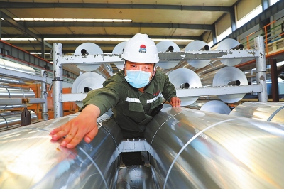4月28日,在郑州市巩义市明泰铝业车间内,检验员正在做铝箔出厂检测。蔡迅翔 摄