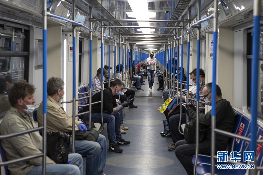 5月12日,在俄罗斯首都莫斯科,人们佩戴口罩乘坐地铁。 新华社发(亚历山大 摄)