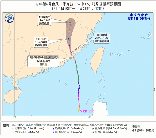 今年第6号台风“米克拉”的中心已于今天(11日)7时30分前后在福建省漳浦县沿海登陆(33米/秒,台风级),11时已减弱为热带风暴级,其中心位于福建省南靖县境内,最大风力有9级(23米/秒),中心最低气压995百帕。受其影响,昨日至今日上午,福建东南部沿海、广东东部沿海、台湾等地部分地区出现大到暴雨,台湾南部局地大暴雨;福建东南部沿海出现10~12级阵风,个别岛屿风力13~15级。