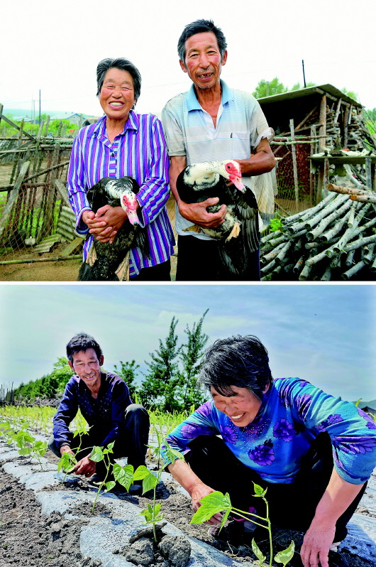 下图为小南河村脱贫户宋文明(左)、杨俊华夫妇在地里劳作。新华社发(冷菊贞摄)