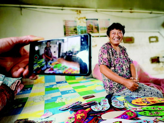 冷菊贞给村民康进香和她制作的鞋垫等手工艺品拍摄短视频(8月18日摄)。新华社记者王建威摄