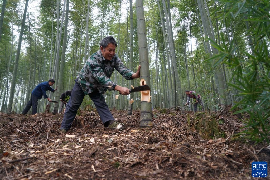 11月16日,在贵州省赤水市宝源乡回龙村,村民砍伐竹子制作装酒的竹筒。新华社发(张鹏 摄)