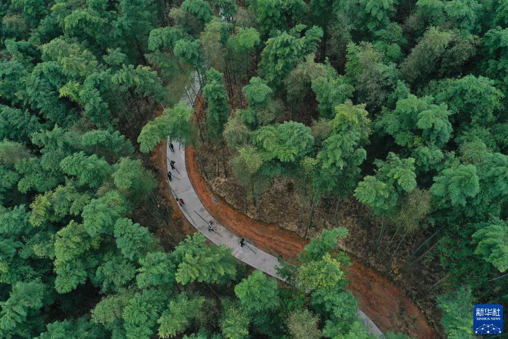 11月16日,在贵州省赤水市宝源乡回龙村,村民搬运注有竹酒的竹子(无人机照片)。新华社发(张鹏 摄)