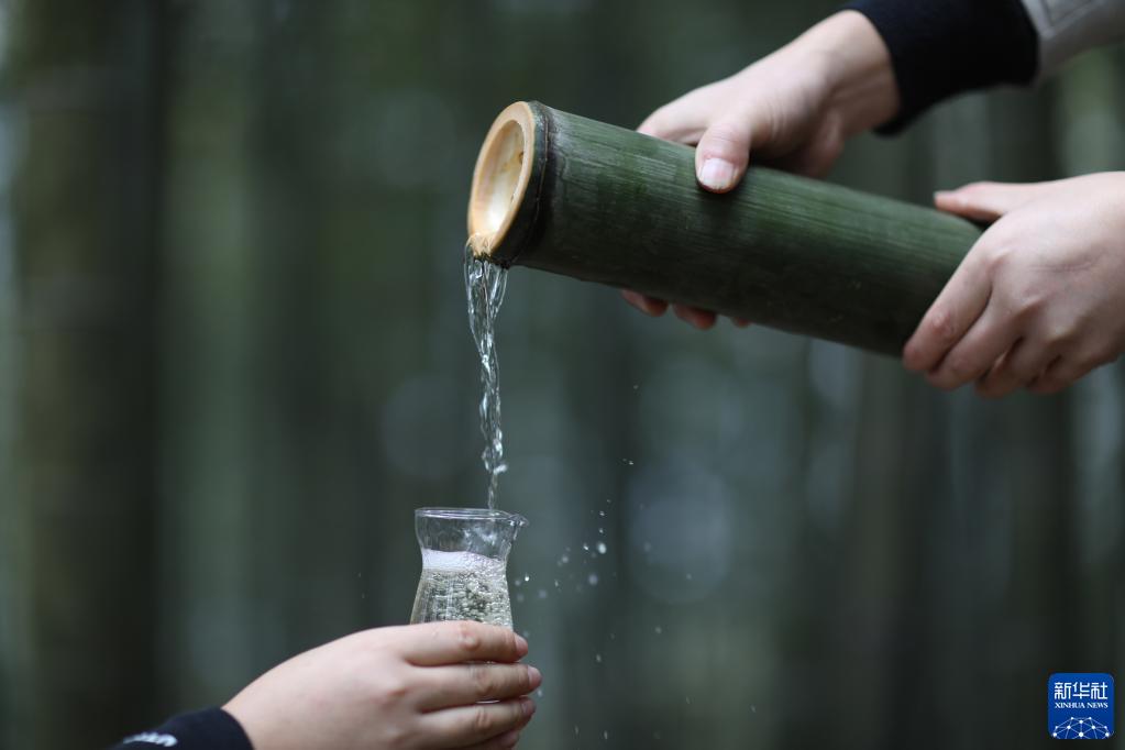 11月16日,在贵州省赤水市宝源乡回龙村,杨贵妃(右)在取竹酒。新华社发(杨洋 摄)