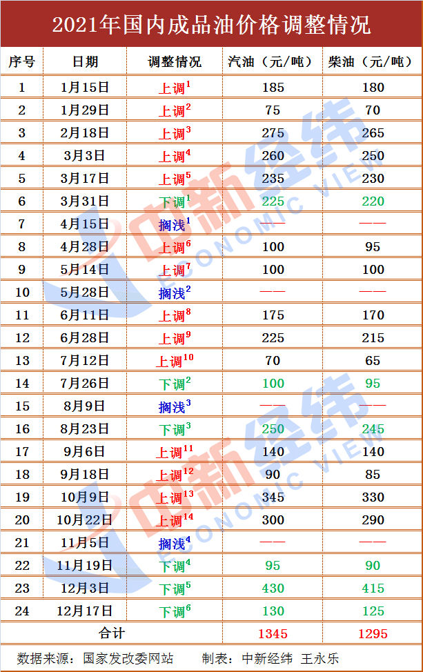 据中新经纬统计,今年以来,国内成品油价格已进行24轮调整,累计“十四涨六跌四搁浅”,汽油价格整体上调1345元/吨,柴油价格整体上调1295元/吨。若本次调整落地,全年成品油调价将呈“十五涨六跌四搁浅”的格局。