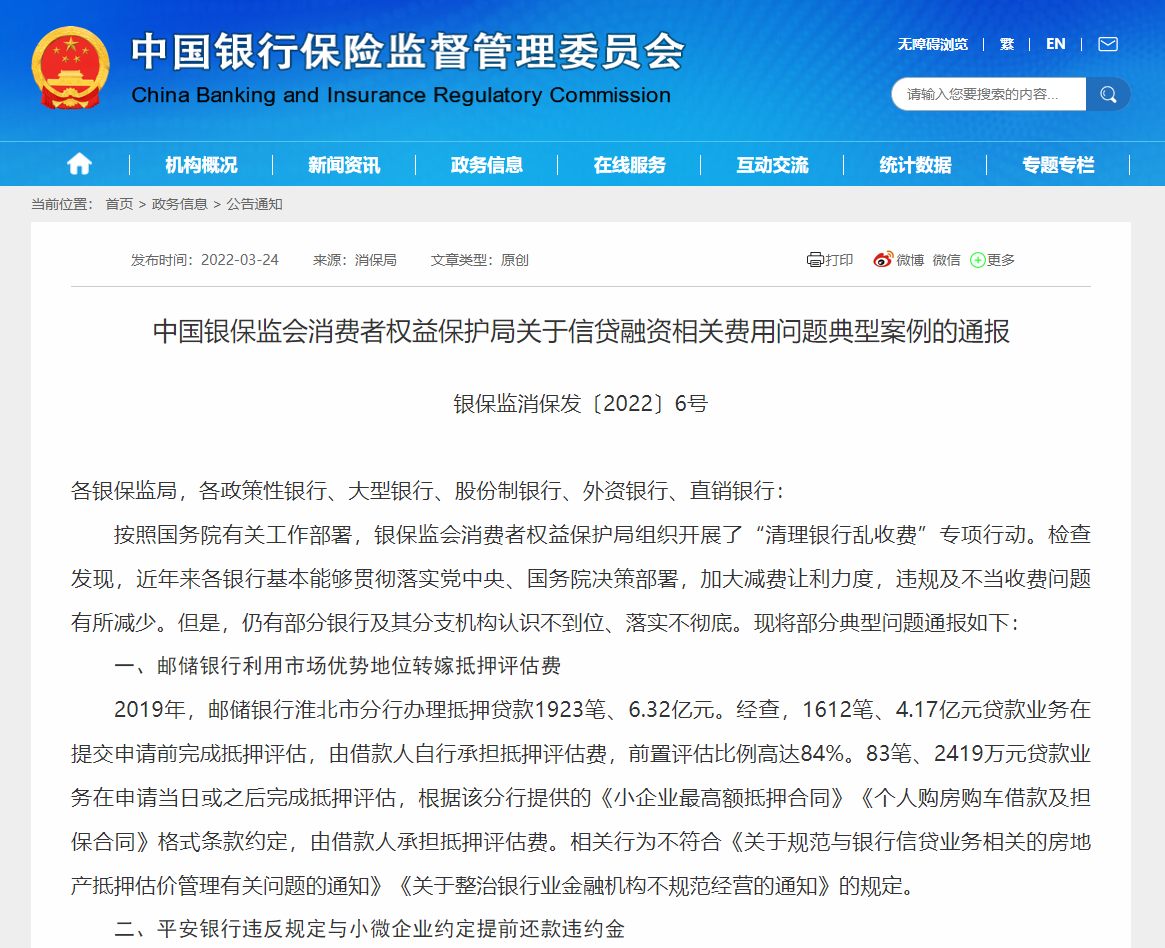 3月24日,中国银保监会消费者权益保护局发布关于信贷融资相关费用问题典型案例的通报,其中,邮储银行、平安银行、邵阳昭阳农村商业银行、象山国民村镇银行四家银行因违规及不当收费问题被点名。