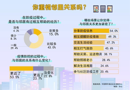 日前,中国青年报社社会调查中心联合问卷网(wenjuan.com),对1151名受访者进行的一项调查显示,75.8%的受访者表示在防疫过程中更重视邻里关系了,53.5%的受访者觉得疫情防控过程中与邻居关系更近了。