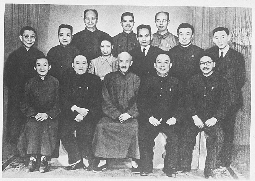 ▶ 1949年9月,民建参加新政协会议的代表、候补代表合影。前排左起:沈子槎、黄炎培、冷遹、杨卫玉、胡厥文;中排左起:章元善、陈巳生、胡子婴、陈维稷、孙起孟、盛康年;后排左起:章乃器、莫艺昌、施复亮。
