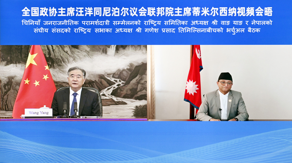 全国政协主席汪洋2日在北京以视频方式会见尼泊尔联邦议会联邦院主席蒂米尔西纳。人民政协报·人民政协网记者 姜贵东 摄